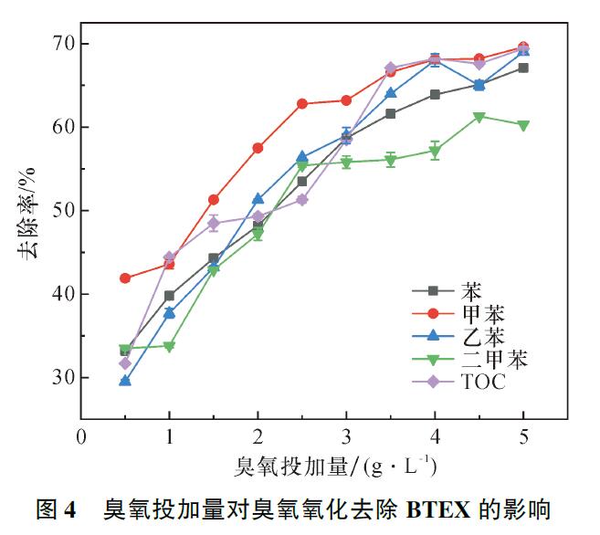 臭氧的通氣量直接影響目標(biāo)有機(jī)污染物的降解效果和實(shí)際處理過(guò)程中的工藝成本。根據(jù)前人的研究成果可知,臭氧濃度越高則有機(jī)物去除率越大。但在實(shí)際處理過(guò)程中,考慮運(yùn)行成本等因素,不能一味增加臭氧投加量來(lái)提高反應(yīng)效率。因此,本研究主要探索臭氧投加量對(duì)BTEX去除的影響(圖4)。