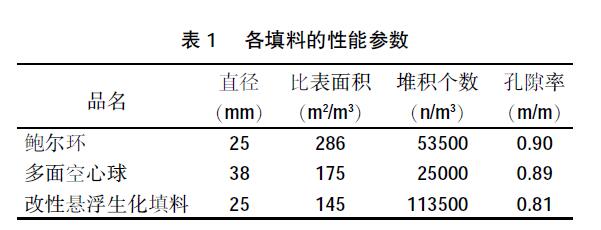 試驗用水是溫度為20℃的自來水,純氧作為氣源,填料分別為多面空心球、鮑爾環(huán)和改性懸浮生化填料。