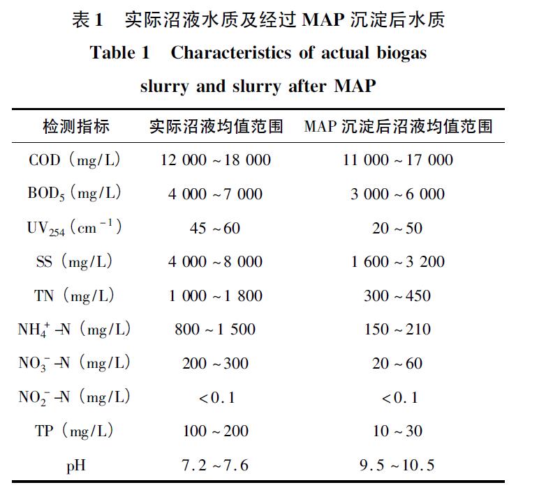 實(shí)驗(yàn)所用厭氧沼液取自陜西省楊凌示范區(qū)某產(chǎn)業(yè)集團(tuán)生豬實(shí)訓(xùn)基地。該場(chǎng)生豬出欄量為18 萬頭/a,豬場(chǎng)廢水主要來自糞尿、豬舍沖洗水,豬場(chǎng)廢水由露天排水溝匯入?yún)捬跽託獬刂校M(jìn)行1 ~ 2 個(gè)月厭氧發(fā)酵。厭氧發(fā)酵后的沼液以MgCl2和Na2HPO4為沉淀劑,進(jìn)行MAP 沉淀反應(yīng)前處理。實(shí)際沼液水質(zhì)及經(jīng)過MAP 沉淀后水質(zhì)情況如表1 所示。