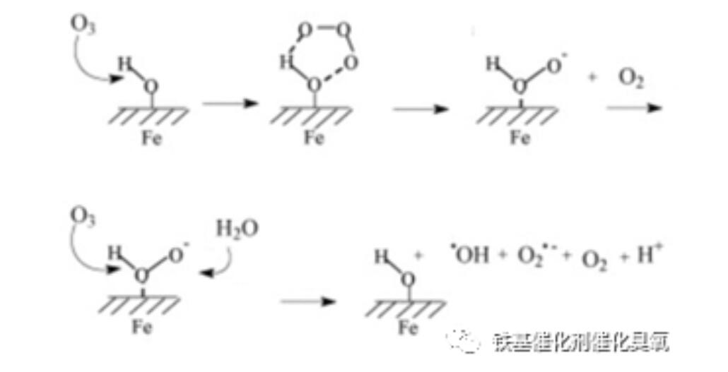 這張圖,是我根據該論文改繪的(見文獻:Tao Zhang, Jun Ma∗. Catalytic ozonation of trace nitrobenzene in waterwith synthetic goethite. Journal ofMolecular Catalysis A: Chemical 279 (2008), 82–89),原理未動,主要是為配合上述化學反應式,稍做改動。由此我認為:不論是臭氧在液相、還是在催化劑表面,形成自由基反應步驟是一樣的。