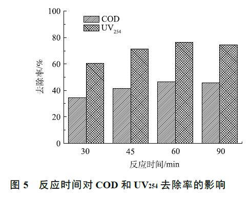 臭氧催化氧化實(shí)驗(yàn)在室溫下進(jìn)行,在廢水初始 pH 為 5,通過調(diào)節(jié)臭氧進(jìn)氣濃度控制臭氧投加量為 300 mg·L−1 的條件下,考察了臭氧催化氧化時(shí)間對(duì)有機(jī)物去除效果的影響,結(jié)果如圖 5 所示。當(dāng)反應(yīng)時(shí)間從 30 min 增至 60 min 時(shí),COD 和 UV254 的去除率分別從 34.6%、60.4% 升高到 46.4%、76.3%,有機(jī)物的去除率隨反應(yīng)時(shí)間的延遲而增加。這是由于·OH 在水中的壽命很短 [22],大約 為 10−9 s,臭氧催化氧化中·OH 氧化反應(yīng)實(shí)際發(fā)生在催化劑周圍,在傳質(zhì)不充分的反應(yīng)條件下,部分·OH 在未知有機(jī)物發(fā)生反應(yīng)之前就已經(jīng)被淬滅。當(dāng)臭氧催化氧化時(shí)間縮短時(shí),單位時(shí)間內(nèi)臭氧投加量加大,產(chǎn)生的·OH 增多,導(dǎo)致大量·OH 未參與反應(yīng)就淬滅,從而導(dǎo)致有機(jī)物去除率下降。當(dāng)反應(yīng)時(shí)間到達(dá)一定的臨界點(diǎn)時(shí),再延長(zhǎng)反應(yīng)時(shí)間,其去除率增加不再明顯,臭氧催化氧化反應(yīng)從 60 min延長(zhǎng)至 90 min 時(shí),COD 和 UV254 的去除率基本不變。